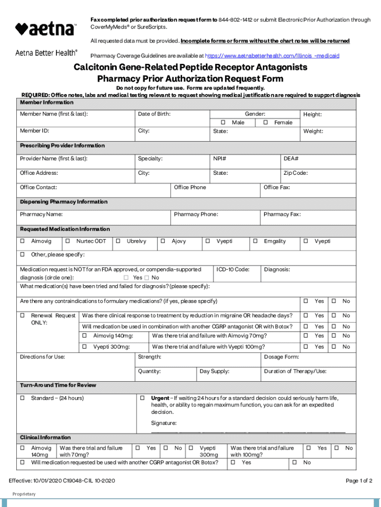 This form is used to request prior authorization for the prescription of Calcitonin Gene-Related Peptide Receptor Antagonists for migraine treatment. It requires comprehensive patient information, details on previous medications tried, and necessary clinical documentation to support the request.