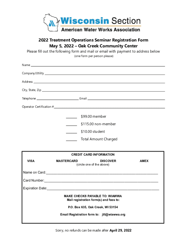 2022 Treatment Operations Seminar Registration Form May 5, 2022 Oak Creek Community Center Please fill out the following form and mail or email with payment to address below (one form per person please)