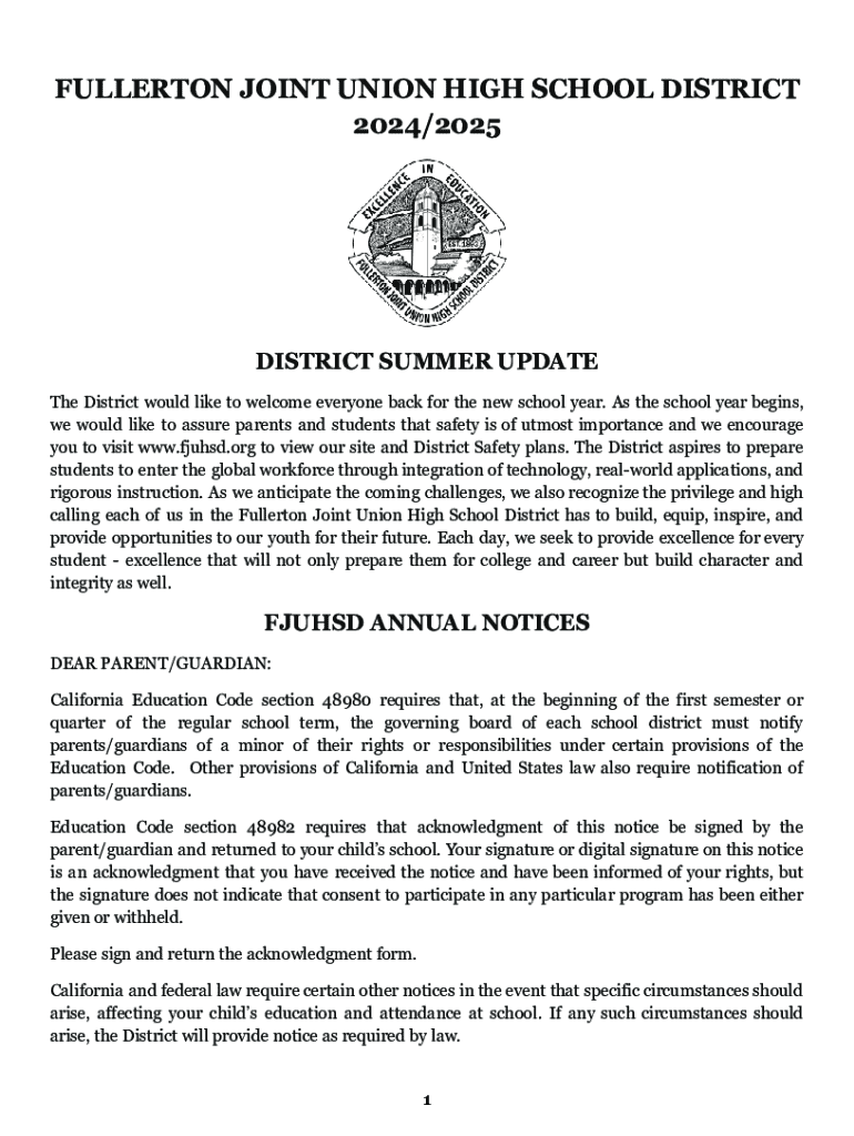 FULLERTON JOINT UNION HIGH SCHOOL DISTRICT 2024/2025DISTRICT SUMMER UPDATE The District would like to welcome everyone back for the new school year. As the school year begins, we would like to assure