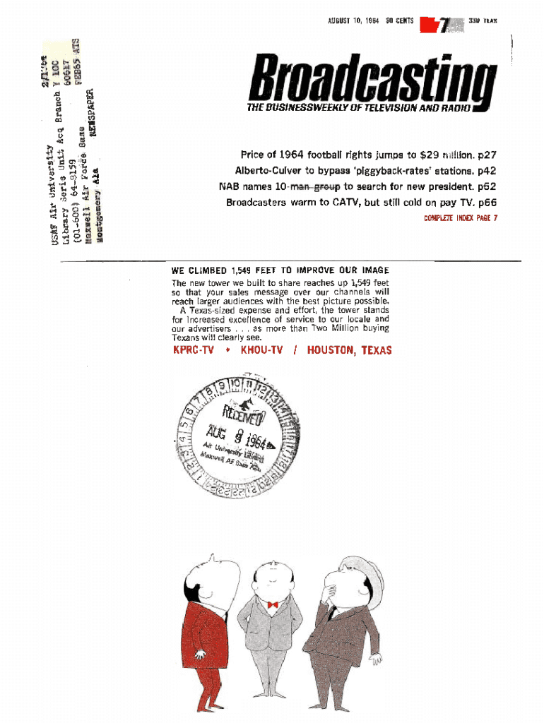AUGUST 10, 196450 CENTS733U 1tAKHroadeaStilfigTHE BUSINESSWEEKLY OF TELEVISION AND RADIOPrice of 1964 football rights jumps to $29 rh!lion. p27Alberto Culver to bypass `piggyback rates\' stations. p42 NAB names 10 mangroup to search for new president. p62 Broadcasters warm to CATV, but still cold on pay TV. p66 COMPLETE INDEX PAGE 7WE CLIMBED 1,549 FEET TO IMPROVE OUR IMAGEThe new tower we built to share reaches up 1,549 feet so that your sales message over our channels will reach