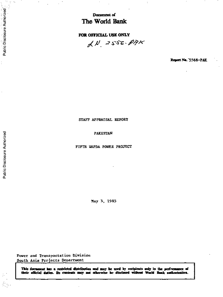 Public Disclosure AuthorizedDocument ofThe World Bank FOR OMICAL USE ONLYvA/ ,cSsVDCPublic Disclosure AuthorizedRepo Ni.5568PAKPublic Disclosure AuthorizedSTAFF APPRAISAL REPORTPAKISTANPublic Disclosure