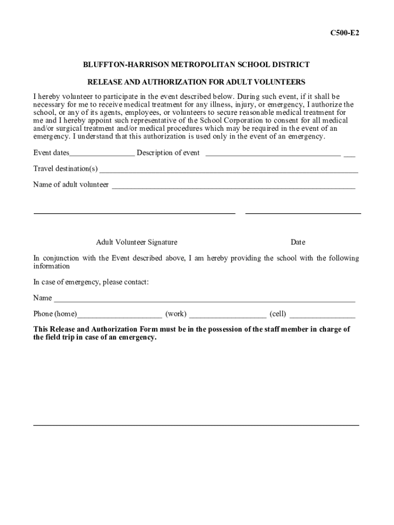 C500E2BLUFFTONHARRISON METROPOLITAN SCHOOL DISTRICT RELEASE AND AUTHORIZATION FOR ADULT VOLUNTEERS I hereby volunteer to participate in the event described below. During such event, if it shall be
