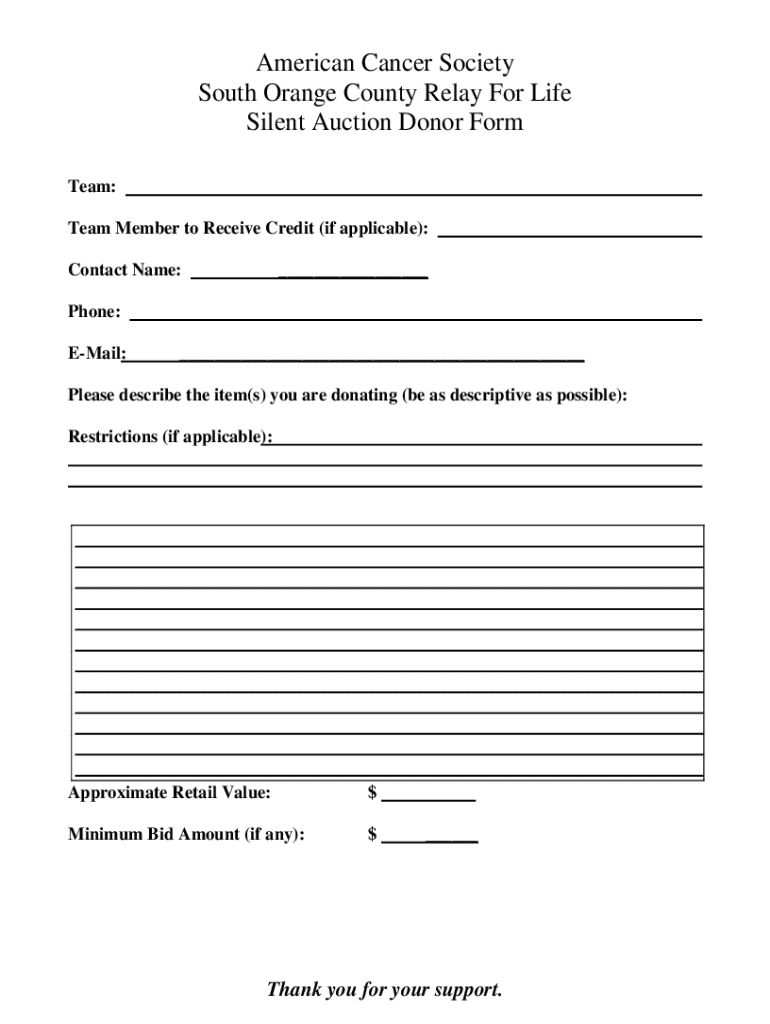 American Cancer Society South Orange County Relay For Life Silent Auction Donor Form Team: Team Member to Receive Credit (if applicable): Contact Name:___Phone: EMail:___Please describe the item(s)