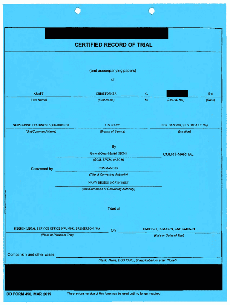 CERTIFIED RECORD OF TRIAL(and accompanying papers) of KRAFTCHRISTOPHER(Last Name)(First Name)SUB1ARINE READINESS SQUADRON 31 (Unit/Command Name)C.E6Ml(DoDIDNo.)(Rank)US NAVYNBK BANGOR, SILVERDALE,