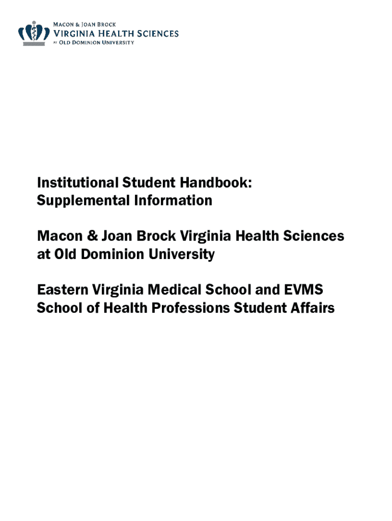 This handbook provides supplemental information for students enrolled at the Macon & Joan Brock Virginia Health Sciences at Old Dominion University and EVMS School of Health Professions. It outlines policies, rights, responsibilities, and available resources for students, ensuring compliance with academic and institutional guidelines.
