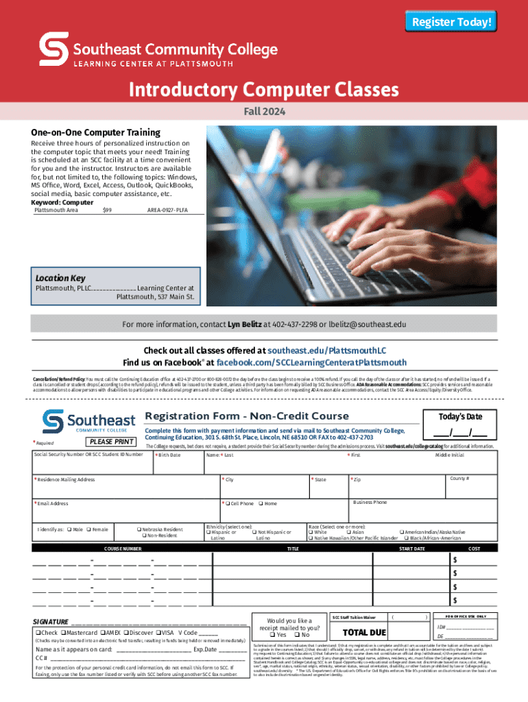 Register Today!Introductory Computer Classes Fall 2024 OneonOne Computer TrainingReceive three hours of personalized instruction on the computer topic that meets your need! Training is scheduled at