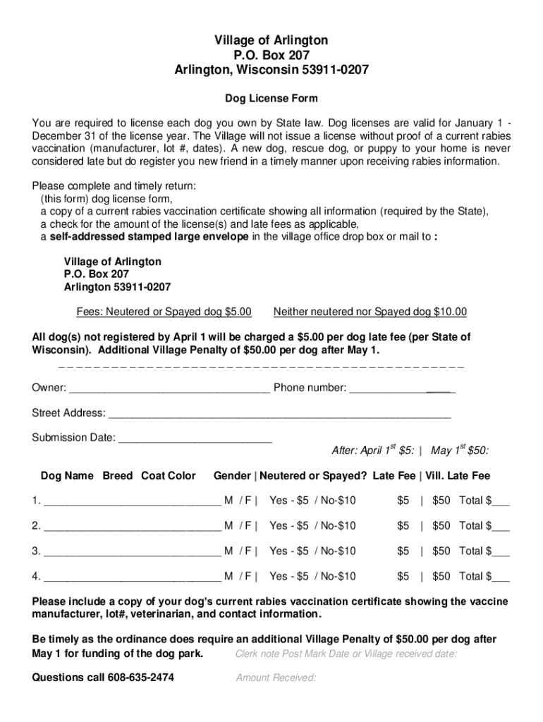 Village of Arlington P.O. Box 207 Arlington, Wisconsin 539110207 Dog License Form You are required to license each dog you own by State law. Dog licenses are valid for January 1 December 31 of the