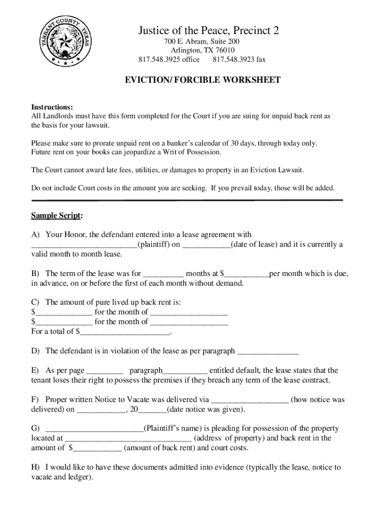 The evictionforcible worksheet is a legal document used in eviction proceedings that outlines the details relevant to the eviction process, including information about the tenant and the property involved.