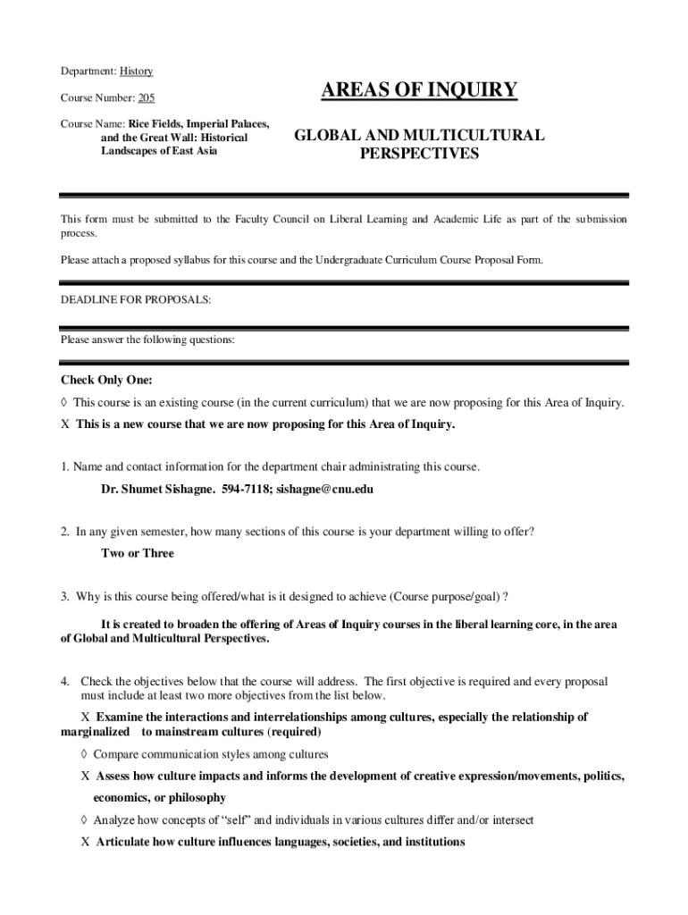 Department: History Course Number: 205 Course Name: Rice Fields, Imperial Palaces, and the Great Wall: Historical Landscapes of East AsiaAREAS OF INQUIRY GLOBAL AND MULTICULTURAL PERSPECTIVESThis