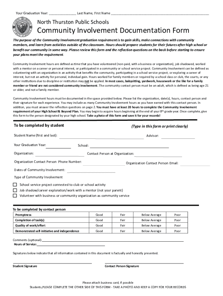 This document outlines the Community Involvement graduation requirement for students in North Thurston Public Schools. It details the criteria for documenting community involvement hours, reflection questions, and the necessary signatures of the student and contact person. Students must complete at least 20 hours of non-paid community service or career exploration to fulfill their high school requirements.