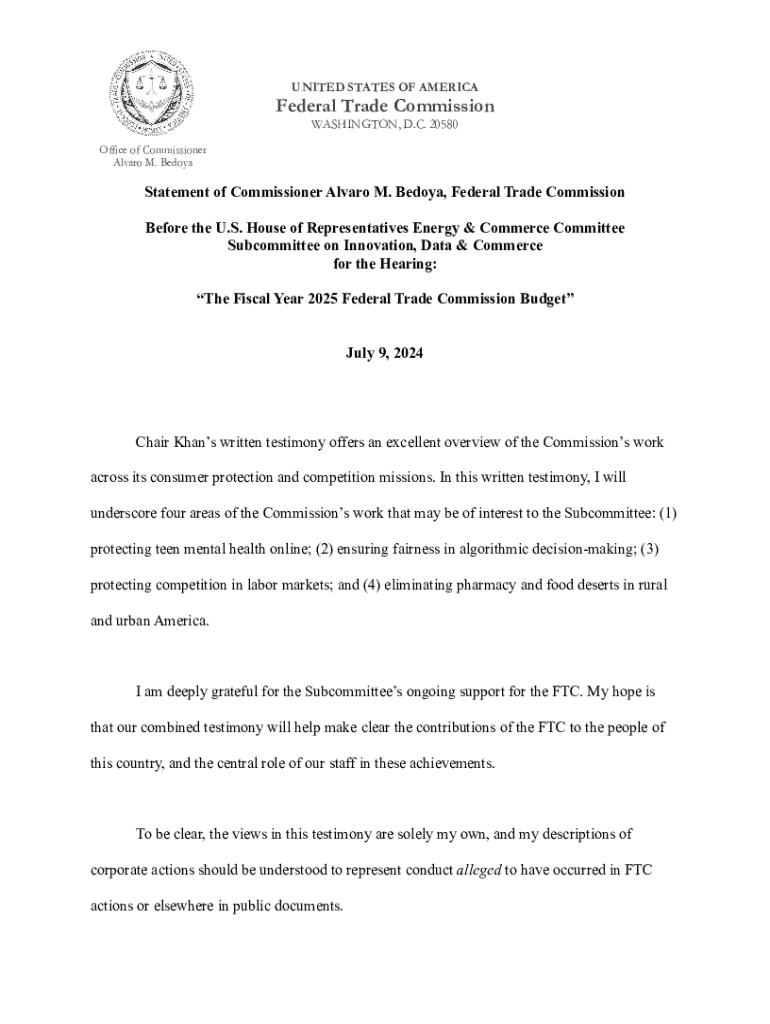 UNITED STATES OF AMERICAFederal Trade Commission WASHINGTON, D.C. 20580Office of Commissioner Alvaro M. BedoyaStatement of Commissioner Alvaro M. Bedoya, Federal Trade Commission Before the U.S. House
