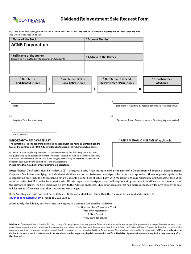 This form is used by ACNB Corporation shareholders to request the sale of shares under the Dividend Reinvestment and Stock Purchase Plan. It includes details such as the owner\'s name, account number, number of shares to be sold, and requires necessary signatures and documentation.
