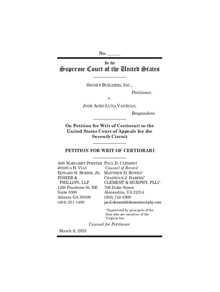 No. ___ In theSupreme Court of the United States ___SIGNET BUILDERS, INC., v.Petitioner,JOSE AGEO LUNA VANEGAS, ___Respondent.On Petition for Writ of Certiorari to the United States Court of Appeals