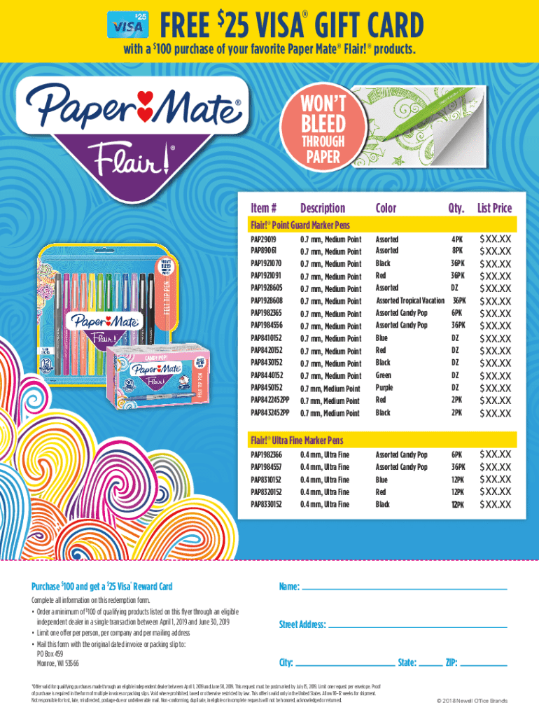 FREE 25 VISA GIFT CARD $with a 100 purchase of your favorite Paper Mate Flair! products. $WONTBLEED THROUGHPAPERItem #DescriptionColorQty. List PriceAssorted Assorted Black Red Assorted Assorted Tropical