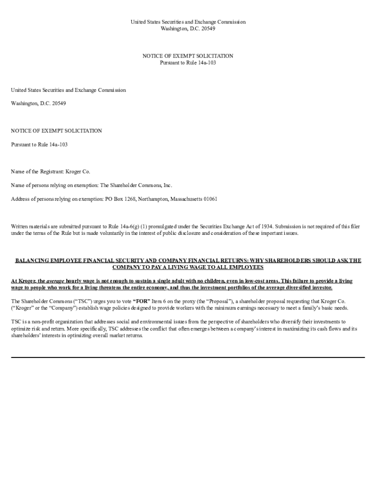 This document is a notice submitted to the SEC regarding a shareholder proposal urging Kroger Co. to pay a living wage to all employees. The Shareholder Commons asserts that inadequate wages threaten both the economy and investment portfolios of diversified shareholders. It presents arguments on the impact of poverty wages, income inequality, and calls for a living wage to protect the financial interests of shareholders.