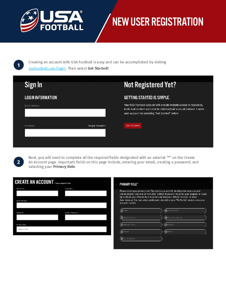 This document outlines the steps for new users to register for an account with USA Football, including account creation, searching for organizations, and purchasing coaching certifications.