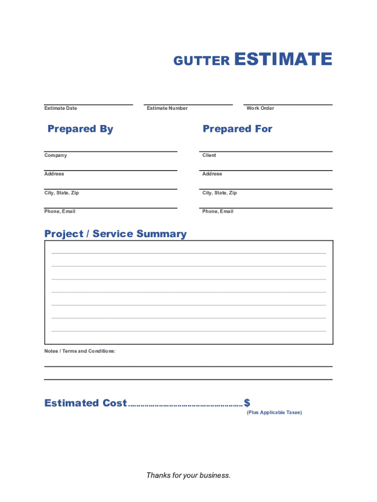 The form should report information such as the type of gutters, estimated costs, labor expenses, materials required, and any relevant project timelines.