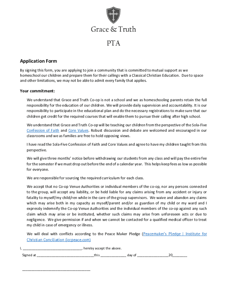 Grace & Truth PTA Application Form By signing this form, you are applying to join a community that is committed to mutual support as we homeschool our children and prepare them for their callings