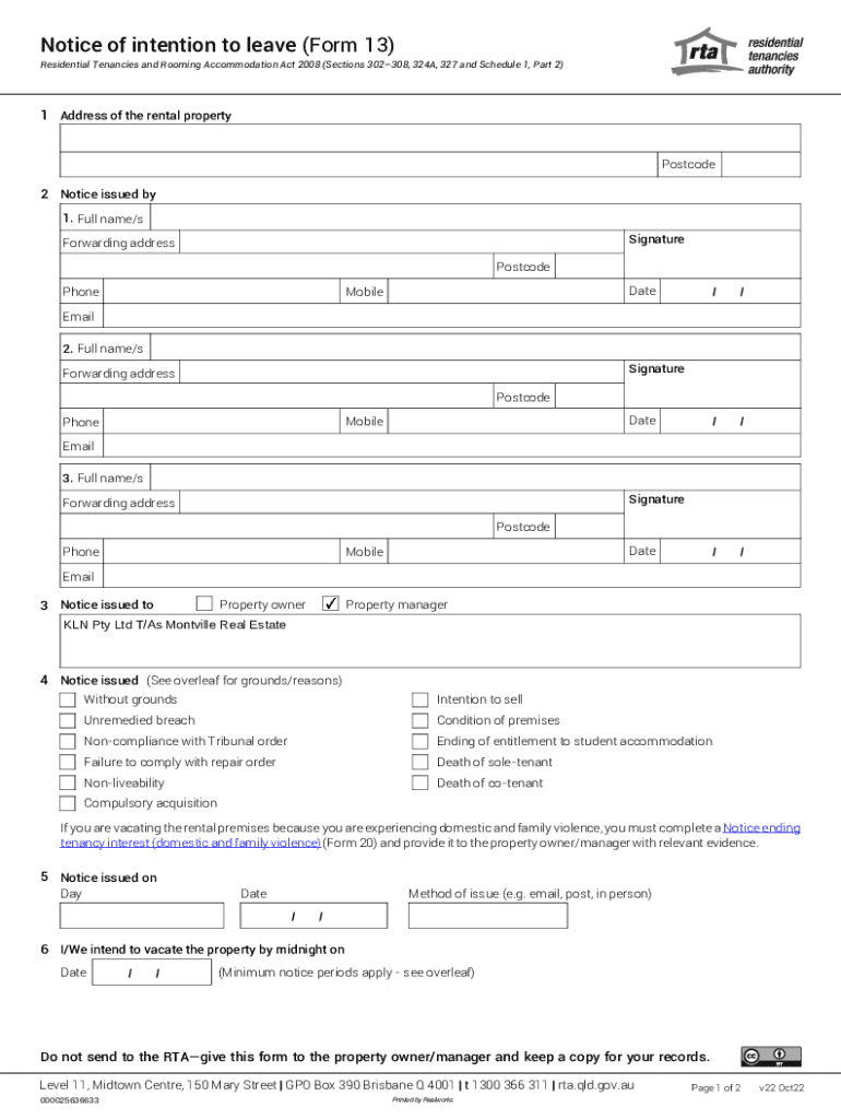 This form is used by tenants to formally notify their property owner or manager of their intention to vacate a rental property. It outlines various grounds for leaving and details the necessary information and contact details of the tenant, property owner, and method of notice delivery.