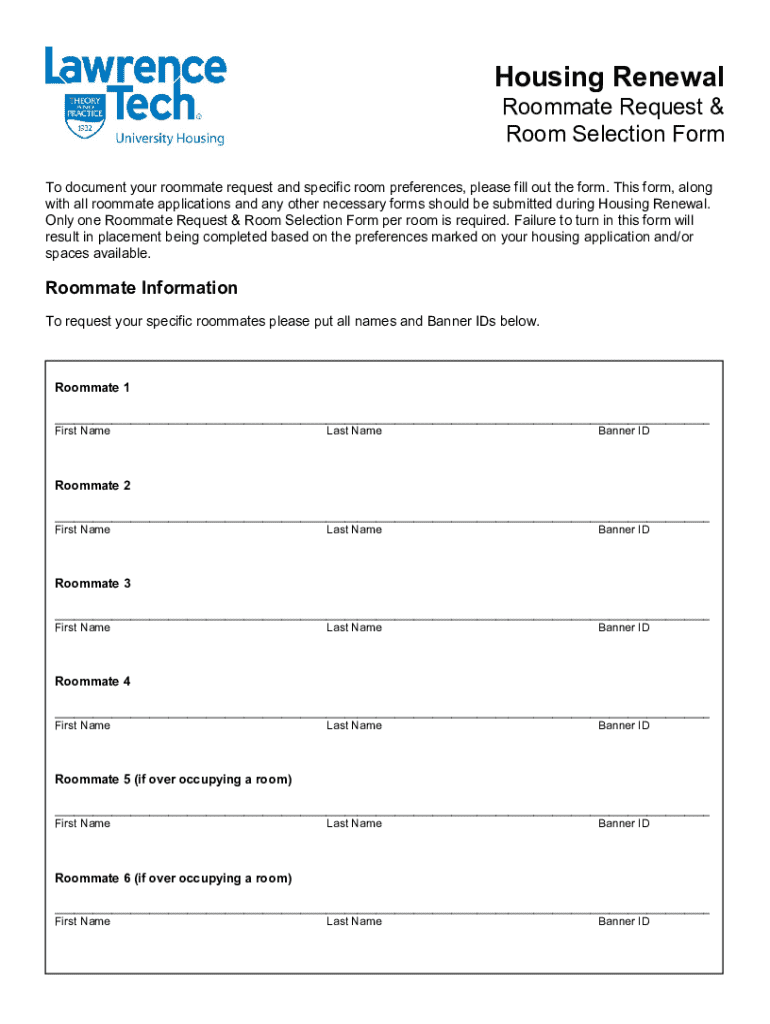 This form is designed for students to document their roommate requests and specific room preferences during the Housing Renewal process. Students must fill out the form, entering the names and Banner IDs of preferred roommates while ranking their building and room type preferences.