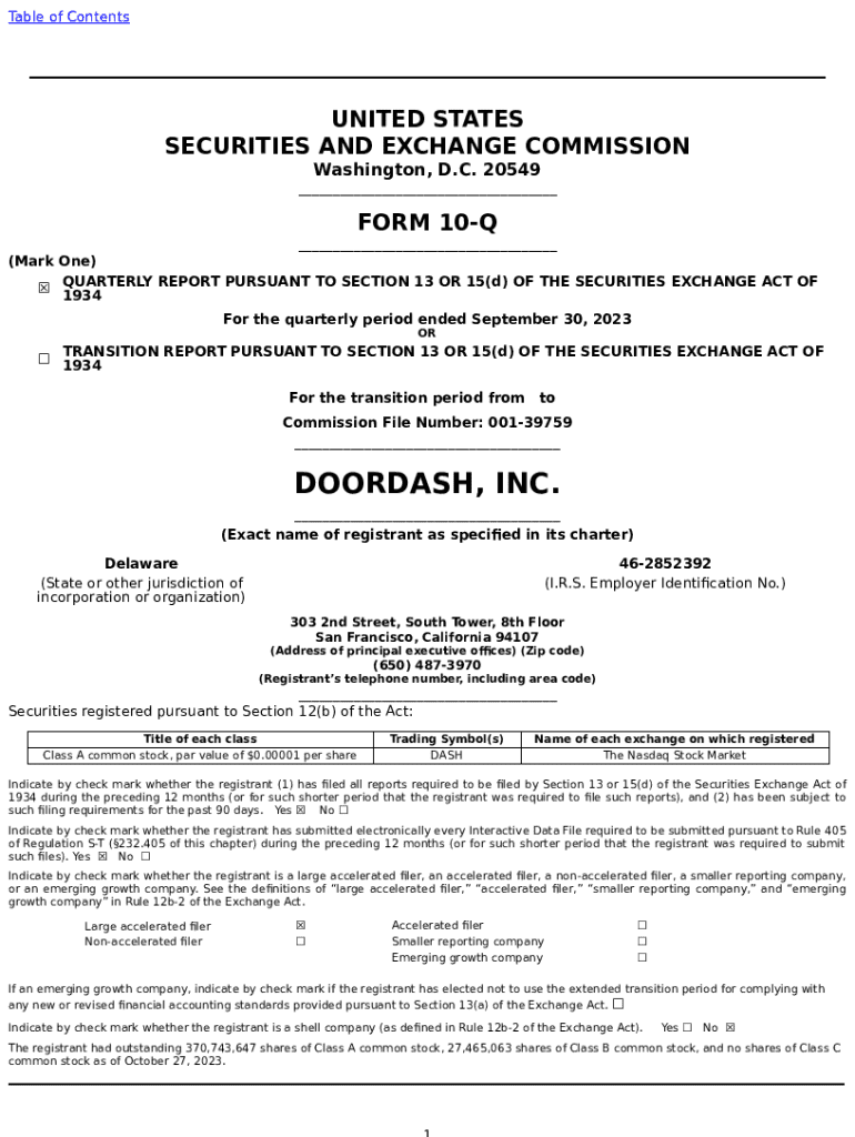 This document is a quarterly report filed by DoorDash, Inc. with the SEC for the period ending September 30, 2023. It includes financial statements, management discussion and analysis, and information regarding the company\'s operations and financial condition. The report provides insights into the company\'s growth, challenges, and future prospects in the local commerce platform industry.