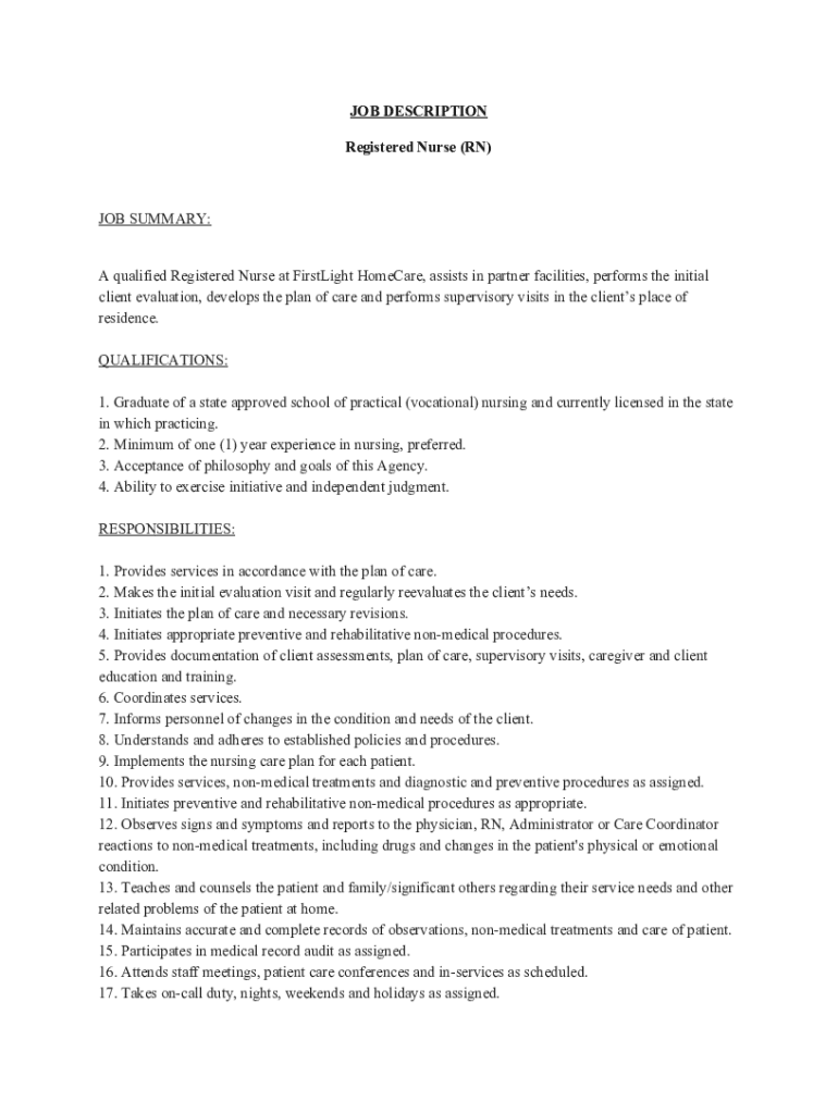 JOB DESCRIPTION Registered Nurse (RN)JOB SUMMARY:A qualified Registered Nurse at FirstLight HomeCare, assists in partner facilities, performs the initial client evaluation, develops the plan of care