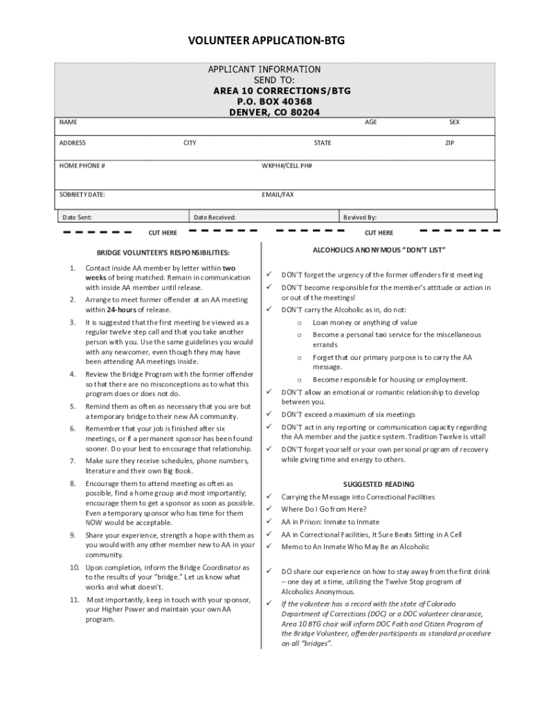 VOLUNTEER APPLICATIONBTG APPLICANT INFORMATION SEND TO: AREA 10 CORRECTIONS/BTG P.O. BOX 40368 DENVER, CO 80204 NAMEAGEADDRESSCITYSTATEHOME PHONE #WKPH#/CELL PH#SOBRIETY DATE:EMAIL/FAXDate Sent:1.Date