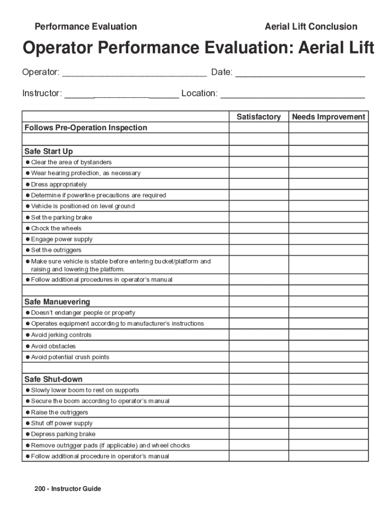 This document provides a comprehensive evaluation format for assessing the performance of operators utilizing aerial lifts. It includes sections for satisfactory performance, operator instructions, and procedures for pre-operation inspection, safe maneuvering, and safe shut-down protocols.