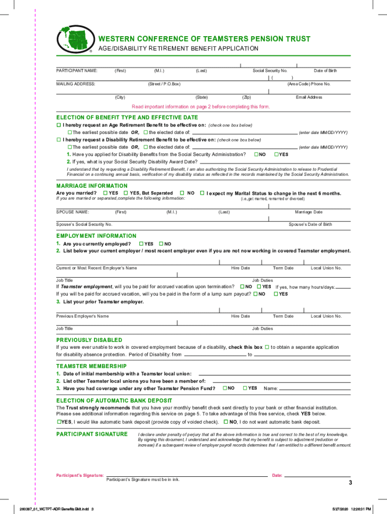 Western Conference of Teamsters Pension TrustApplication for Age & Disability Retirement Benefits260387_01_WCTPTADR Benefits Bklt.indd 15/21/2020 10:53:41 AMWestern Conference of Teamsters Pension