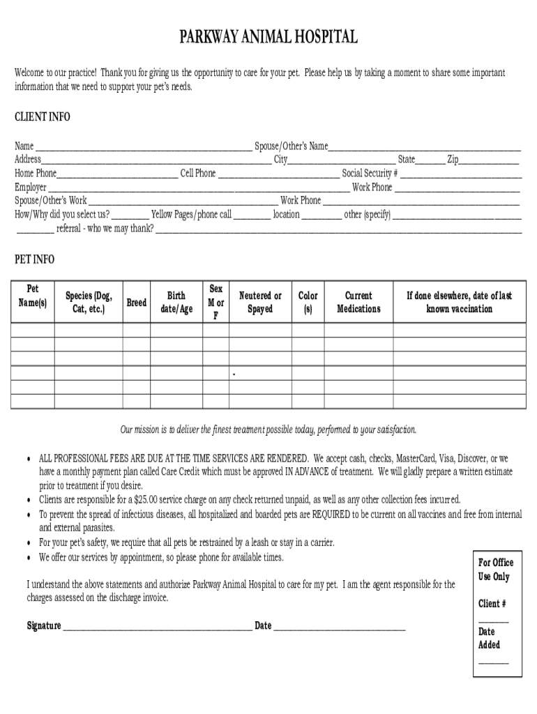 PARKWAY ANIMAL HOSPITAL Welcome to our practice! Thank you for giving us the opportunity to care for your pet. Please help us by taking a moment to share some important information that we need to
