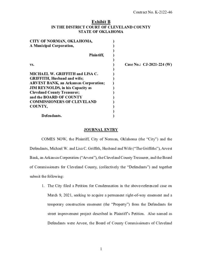 Contract No. K212246Exhibit B IN THE DISTRICT COURT OF CLEVELAND COUNTY STATE OF OKLAHOMA CITY OF NORMAN, OKLAHOMA, A Municipal Corporation, Plaintiff, vs. MICHAEL W. GRIFFITH and LISA C. GRIFFITH,