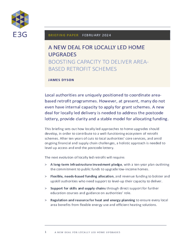 This briefing paper outlines the need for a new deal in locally led home upgrade initiatives that can effectively coordinate area-based retrofit schemes. It discusses the current challenges faced by local authorities in accessing funding and implementing upgrades to the UK\'s housing stock to meet energy efficiency and carbon reduction targets. The paper proposes a long-term infrastructure investment plan and calls for flexible funding models to enhance the capacity of local authorities to...