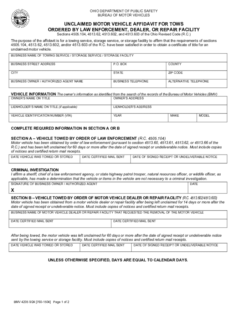 OHIO DEPARTMENT OF PUBLIC SAFETY BUREAU OF MOTOR VEHICLESUNCLAIMED MOTOR VEHICLE AFFIDAVIT FOR TOWS ORDERED BY LAW ENFORCEMENT, DEALER, OR REPAIR FACILITY Sections 4505.104, 4513.62, 4513.602, and