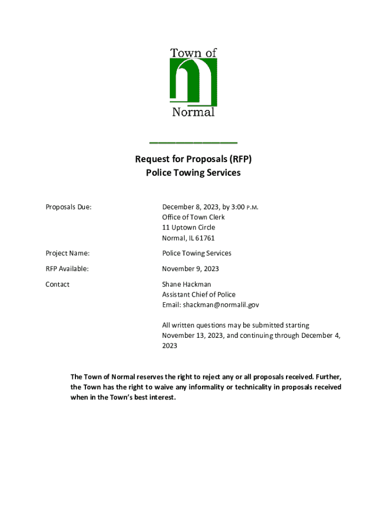 ___ Request for Proposals (RFP) Police Towing Services Proposals Due:December 8, 2023, by 3:00 P.M. Office of Town Clerk 11 Uptown Circle Normal, IL 61761Project Name:Police Towing ServicesRFP Available:November