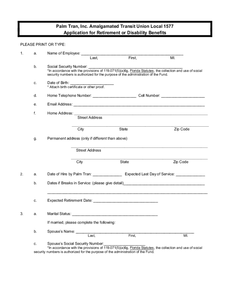This document is an application form for employees of Palm Tran, Inc. to apply for retirement or disability benefits. It collects personal information from the employee, details on their employment history, marital status, and beneficiaries for death benefits. The form also includes sections for spousal consent and direct deposit authorization.