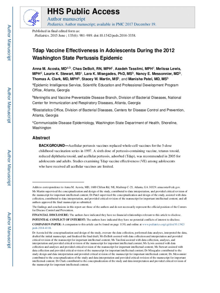 HHS Public Access Author manuscript Author ManuscriptPediatrics. Author manuscript; available in PMC 2017 December 19. Published in final edited form as: Pediatrics. 2015 June ; 135(6): 981989. doi:10.1542/peds.20143358.Tdap