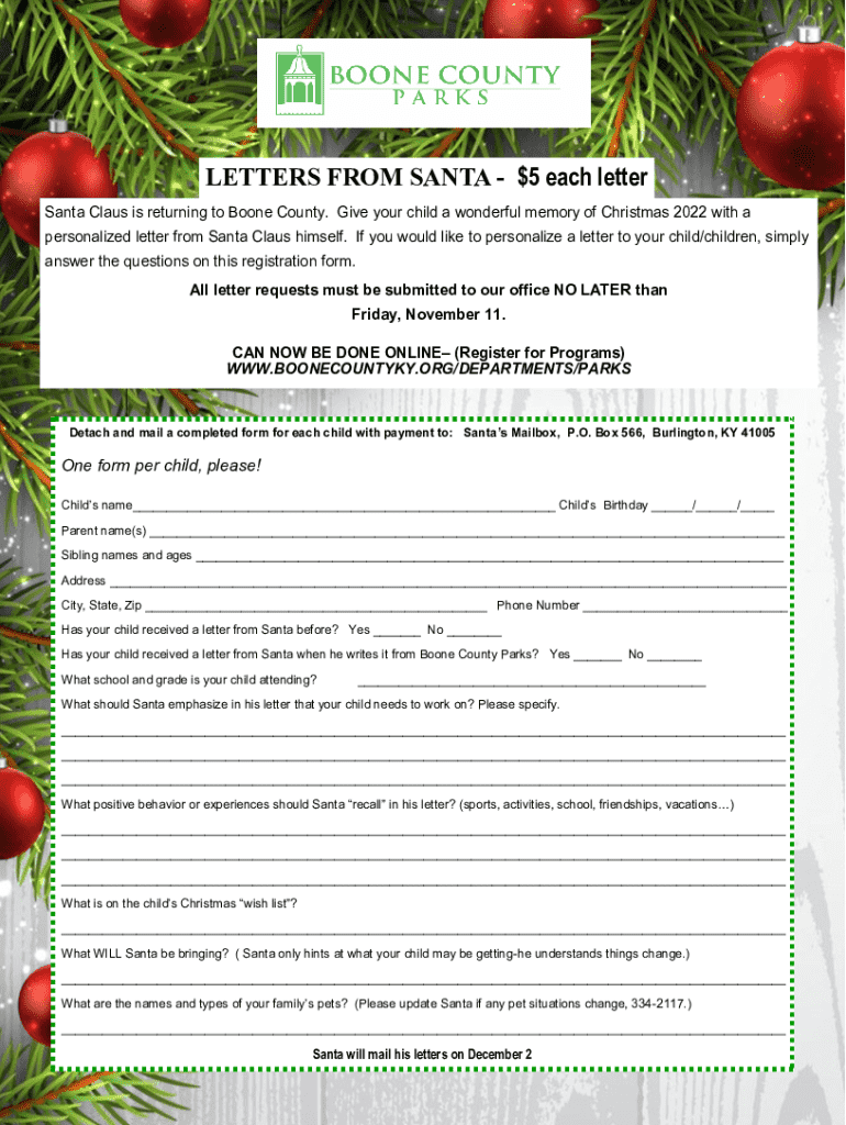 LETTERS FROM SANTA $5 each letter Santa Claus is returning to Boone County. Give your child a wonderful memory of Christmas 2022 with a personalized letter from Santa Claus himself. If you would like