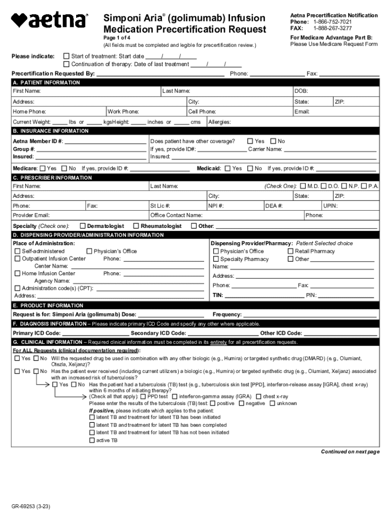 Aetna Precertification Notification Phone: 18667527021 FAX: 18882673277Simponi Aria () Infusion Medication Precertification Request For Medicare Advantage Part B: Please Use Medicare Request FormPage 1 of 4 (All fields must be completed and legible for precertification review.)Please indicate:Start of treatment: Start date / / Continuation of therapy: Date of last treatment//Precertification Requested By:Phone:Fax:A. PATIENT INFORMATIONFirst Name:Last Name:Address:DOB:City:Home