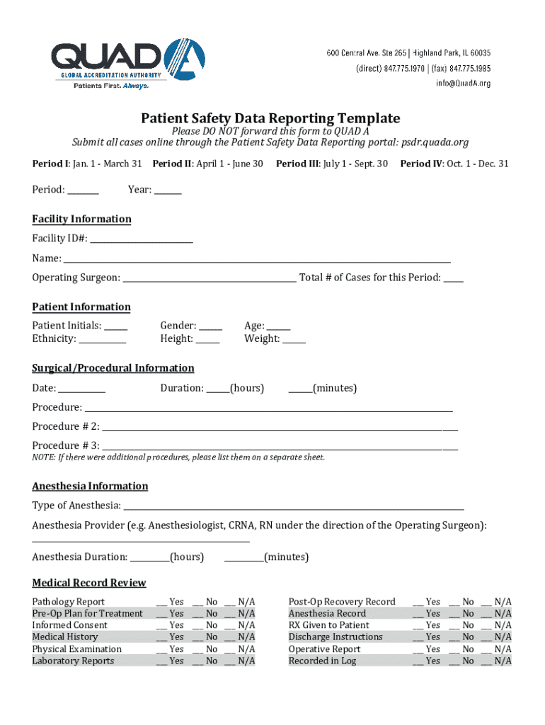 Patient Safety Data Reporting TemplatePlease DO NOT forward this form to QUAD A Submit all cases online through the Patient Safety Data Reporting portal: psdr.quada.org Period I: Jan. 1 March 31 Period