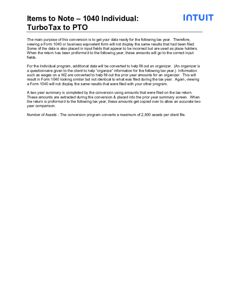 Items to Note 1040 Individual: TurboTax to PTO The main purpose of this conversion is to get your data ready for the following tax year. Therefore, viewing a Form 1040 or business equivalent form
