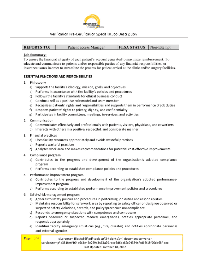 Verification PreCertification Specialist Job Description REPORTS TO:Patient access ManagerFLSA STATUSNonExemptJob Summary: To ensure the financial integrity of each patients account generated to maximize