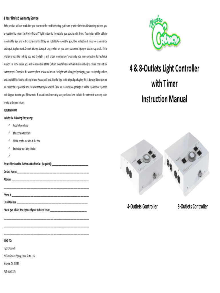 1 Year Limited Warranty Service If the product will not work after you have read the troubleshooting guide and practiced the troubleshooting options, you are advised to return the Hydro Crunch light