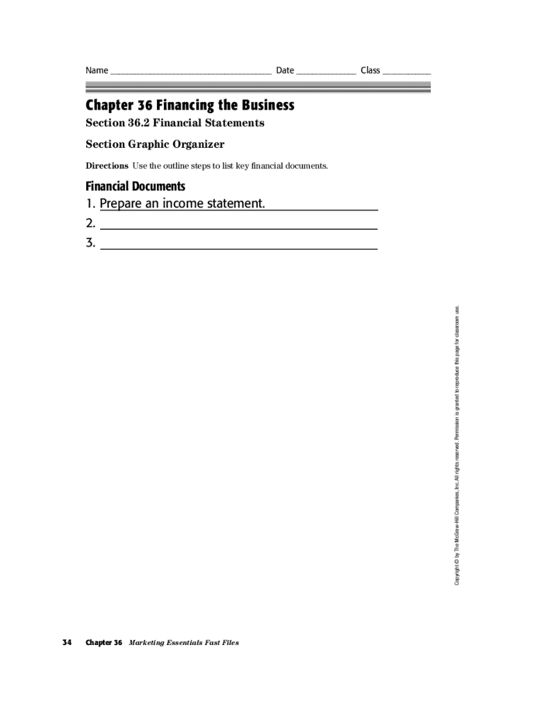 This document focuses on Chapter 36 of the Marketing Essentials curriculum, specifically discussing financial statements and the key financial documents necessary for financing a business. It provides a structured outline for students to list and prepare these financial documents including income statements.