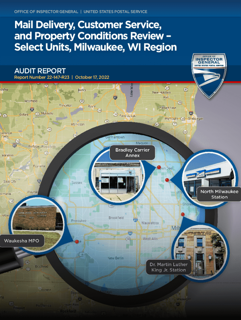 This audit report presents findings related to mail delivery, customer service, and property conditions across select postal units in the Milwaukee, WI region, highlighting issues such as delayed mail, improper package scanning, and facility maintenance deficiencies.