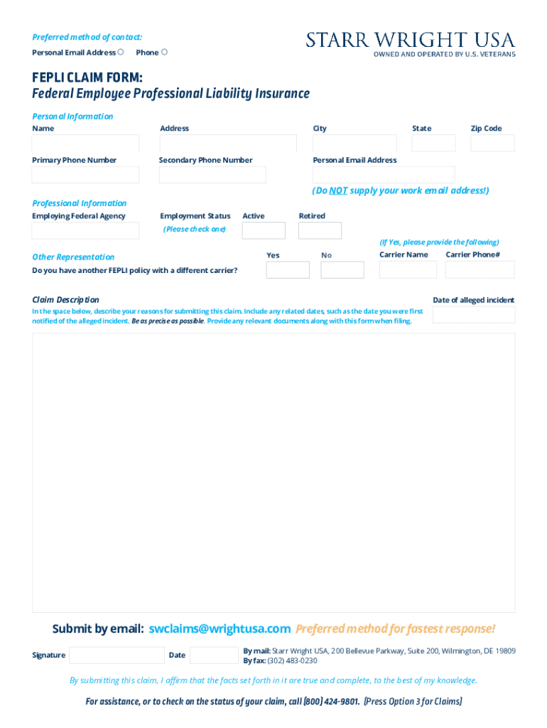 This form is used to submit a claim under the Federal Employee Professional Liability Insurance (FEPLI) program. It collects personal and professional information necessary for processing the claim, including details about the incident and preferred contact methods.