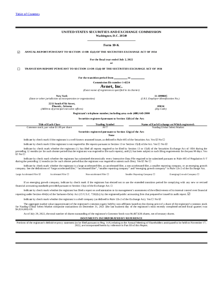 This document is the Annual Report for Avnet, Inc. for the fiscal year ended July 2, 2022, detailing the company\'s business operations, financial performance, and various disclosures including risk factors, management\'s discussion, and corporate governance matters.
