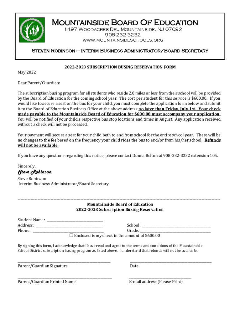 This form is used by parents/guardians to register their children for the subscription busing program offered by the Mountainside Board of Education for the 2022-2023 school year. The program is available for students living 2.0 miles or less from their school, and a fee of $600.00 is required to secure a seat on the bus for the entire school year.