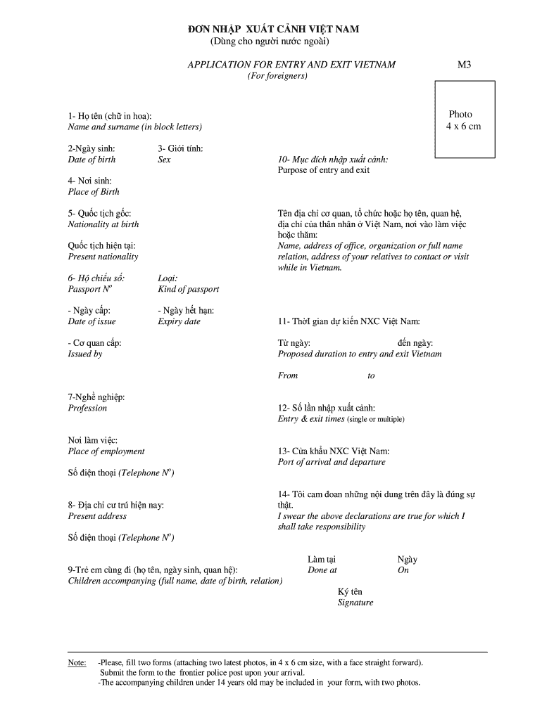 ? N NH P EU T C NH VI T NAM (D NG CHO NG? I n? C NGO i) M3 APPLICATION FOR ENTRY AND EXIT VIETNAM (For foreigners) Photo 4 6 cm 1- H t n (ch in HOA): Name and surname (in block letters) 2-Ng y sing: