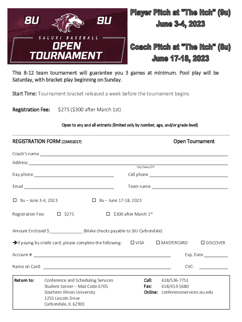 This form is for registering teams for an open tournament taking place in June 2023, with a registration fee structure and details on game format including pool and bracket play.