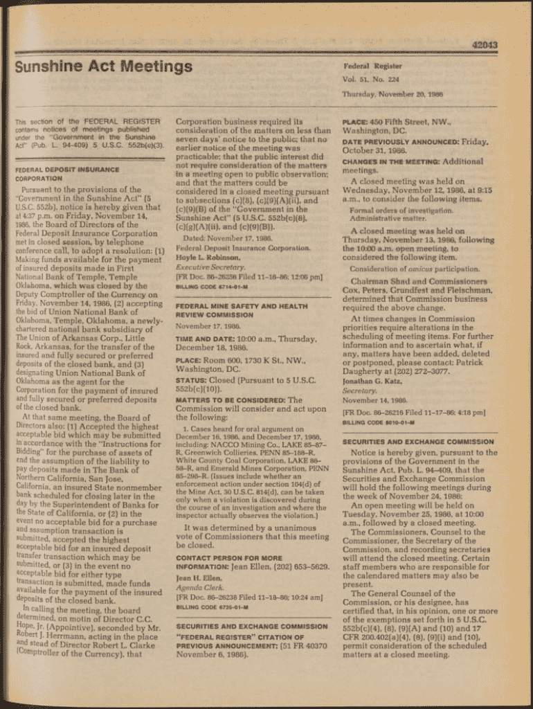 42043Sunshine Act MeetingsFederal RegisterV ol. 51, N o. 224 Thursday, N ovem b er 2 0 ,1 9 8 6This section of the FEDERAL REGISTER contains notices of meetings published under the Government in the